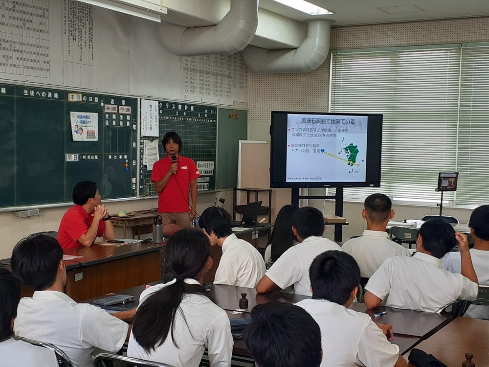 一部二部と分けて、沖縄の海の危険な流れや危険生物、サンゴ礁とSDGsといった内容で行い、校外学習を安全に楽しむため、未来の沖縄を担う高校生にマリン観光事業とサンゴ礁の大切さを感じていただけたら幸いです