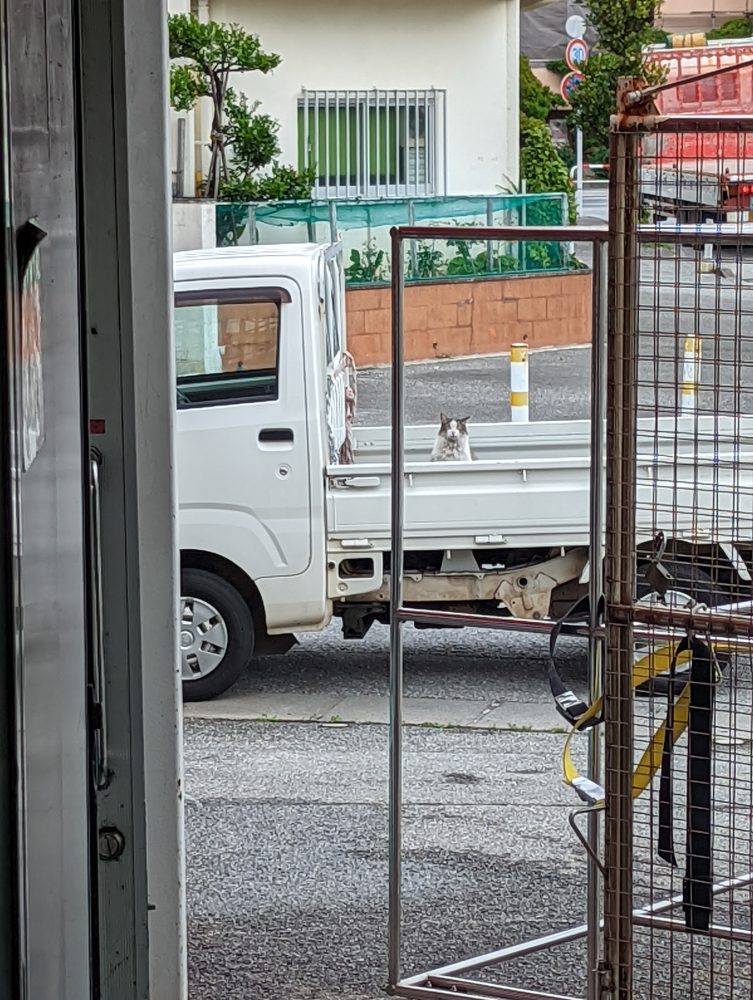 PS 那覇店の近くに住んでいる猫が自分も船に連れてけと言わんばかりに軽トラに乗ってました。
